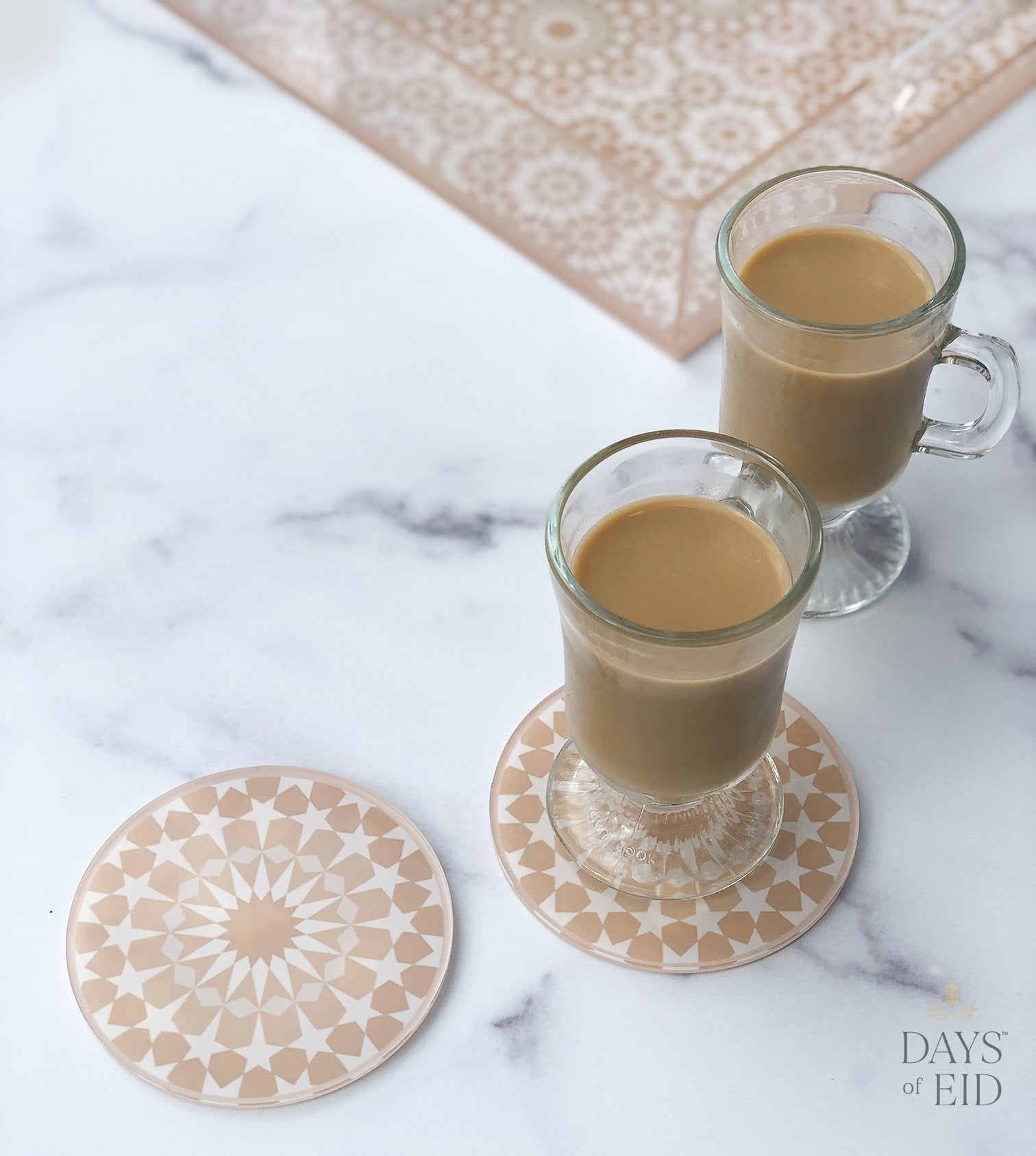 These Acrylic Coasters are made of high-gauge acrylic so they're equal parts sturdy and stylish, just like our Marrakech Acrylic Trays. These coasters comes in 3 color patterns: Blue, Pink & Gray, and Neutral. A Marrakech mosaic design is printed on the bottom making this piece both a modern household item and Islamic artwork in one. These coasters have non-slip material on bottom to prevent from slipping out of place.
