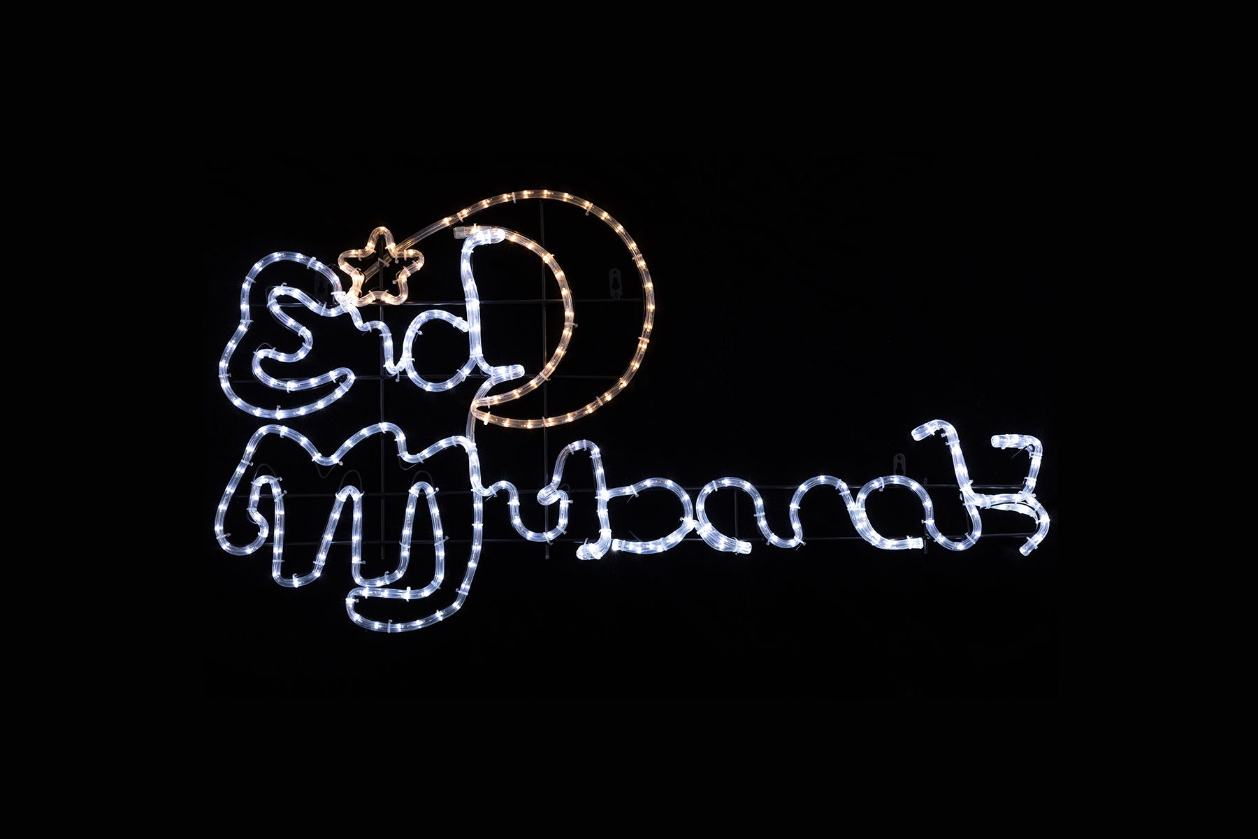 This metal frame sign contains the phrase "Eid Mubarak" in bright white LED rope light along with a crescent moon and star in bright yellow LED rope light. Comes with stand apparatus that allows you to set it up on your front yard securely and can also be hung up in your window or on your balcony using your own hooks. Emits light and is highly visible in daytime and gives off an elegant look at nighttime as well.